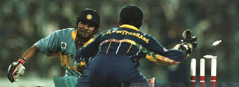 ലോകകപ്പ് ഫൈനലിലെത്താന് 252 റണ്സ് എന്ന കടമ്പ കടക്കാനുറപ്പിച്ച് ബാറ്റിംഗിനിറങ്ങിയ ഇന്ത്യയുടെ തുടക്കവും മോശമായിരുന്നു. സ്കോര് എട്ടിലെത്തി നില്ക്കെ ഓപ്പണര് നവ്ജ്യോത് സിംഗ് സിദ്ദു പുറത്ത്. എന്നാല് പിന്നീടങ്ങോട്ട് സച്ചിന് തെന്ഡുല്ക്കറും സഞ്ജയ് മഞ്ജരേക്കറും ചേര്ന്ന് സ്കോര് പതുക്കെ പതുക്കെ ഉയര്ത്തി. എന്നാല് സ്കോര് 98ലെത്തിയപ്പോള് 65 റണ്സെടുത്ത സച്ചിന് തെന്ഡുല്ക്കര് പുറത്തായി. സനത് ജയസൂര്യയുടെ പന്തില് വിക്കറ്റ് കീപ്പര് റോമേഷ് കലുവിതരണ സച്ചിനെ സ്റ്റംപ് ചെയ്യുകയായിരുന്നു.